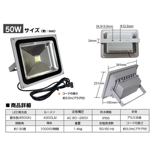 LEDライト LED投光器 50W 昼光色 防水 4300LM(500W相当) 広角130度 ハイパワー 1個