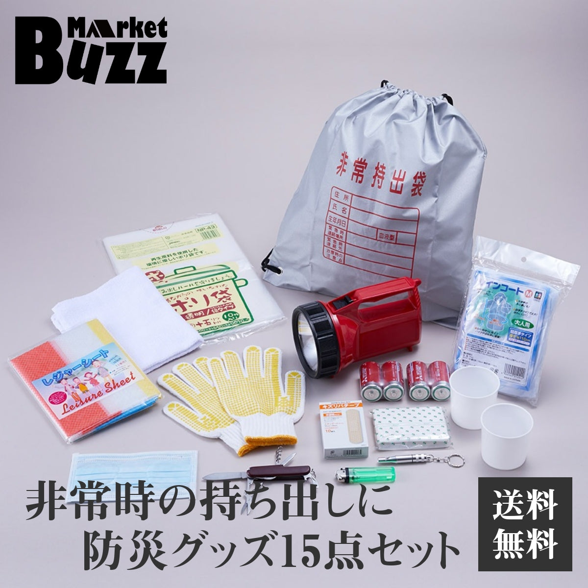 | ・非常持出袋 ・強力ライト ・点灯確認用電池×4 ・万能ナイフ ・コップ ・ポケットティッシュ ・レジャーシート ・タオル ・軍手 ・マスク ・ライター ・レインコート ・ゴミ袋 ・絆創膏 ・アルミホイッスル ※ライターについては、商品カラーがパッケージ写真と異なるモノがございます。 ※レジャーシート・レインコート・救急絆創膏・ゴミ袋については予告無くパッケージ・仕様等を変更する場合がございます。 |