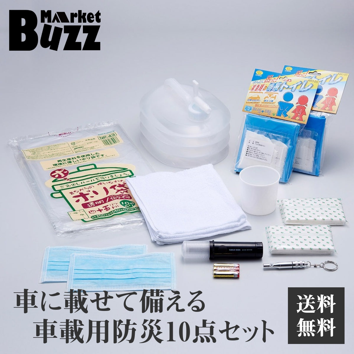 自動車でドライブ中に!車で避難する時に!あったら助かる防災10点セットです。 |