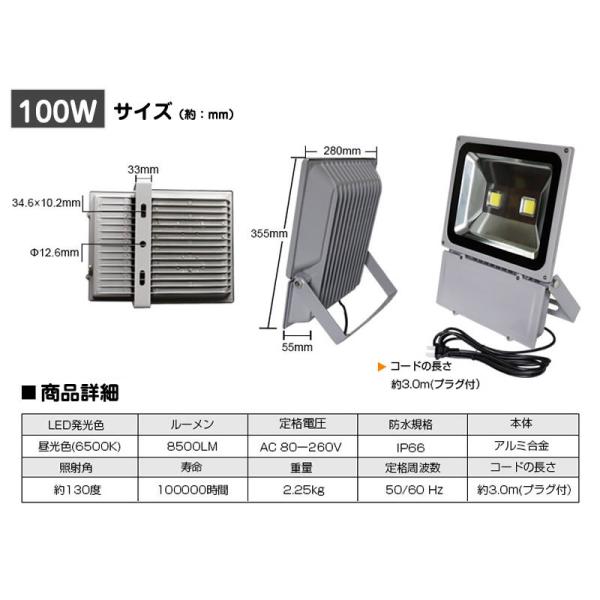 | 消費電力:100W 光束(明るさ):8500LM 色温度(発光色):6500K(昼光色) 照射角:約130度 電源コードの長さ:約3.0m(AC100V用のコンセントプラグ付き) 防水性能:IP66 本体の材質:アルミニウム合金 照射面の材質:強化ガラス 寿命平均:約100,000時間 重さ:約2.25kg 動作電圧:AC100V(50/60Hz対応) サイズ:約横280mm×高さ355mm×奥行55mm 点灯までの時間:コンセントを差してから2〜3秒 |
