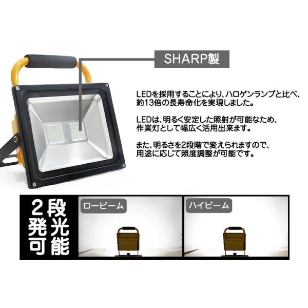 | ■便利な充電式 電源の無い場所や電源が遠い場所で大活躍の充電タイプは、 パッと持ち出してパッと片付けられる非常に便利な投光器です。 ■超大容量のバッテリー 最大約9時間の点灯が可能な超大容量となっており、安心して使用いただけます。 また、バッテリーの寿命を延ばすための保護回路が入っており、 電圧が2.75V以下になると自動消灯します。 ※保護回路無しの商品は、バッテリーの寿命が極端に短くなります。 ■照度調整可能 スイッチ一つで明るさが2段階に変えられるので、用途に応じて調整が可能です。 ■自由度の高い角度調整機能 左右360度の回転が出来るので本体を置いたままでもかなり広範囲への角度調整が可能です。 ■充電電源が2パターン 家庭用コンセント電源(AC100V)と自動車用シガー電源(DC12V/24V)で充電可能です。 自動車で移動中にも充電が出来るので便利です。 ■高防塵・防水性能 防水性能は、IP規格でIP65の性能となっております。 基準値で防塵性能は、最大レベル! 防水性能は、1分間に12.5Lの流水を掛けても問題が無いレベルです! ■使用例 夜釣り、キャンプ、アウトドア、夜間作業、野外作業場、工事現場、駐車場 等・・・ |
