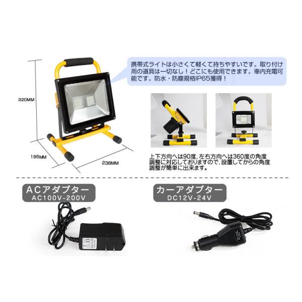 | ・充電式LED投光器本体 × 1 ・家庭電源用AC充電アダプター × 1 ・自動車用DC充電アダプター × 1 |