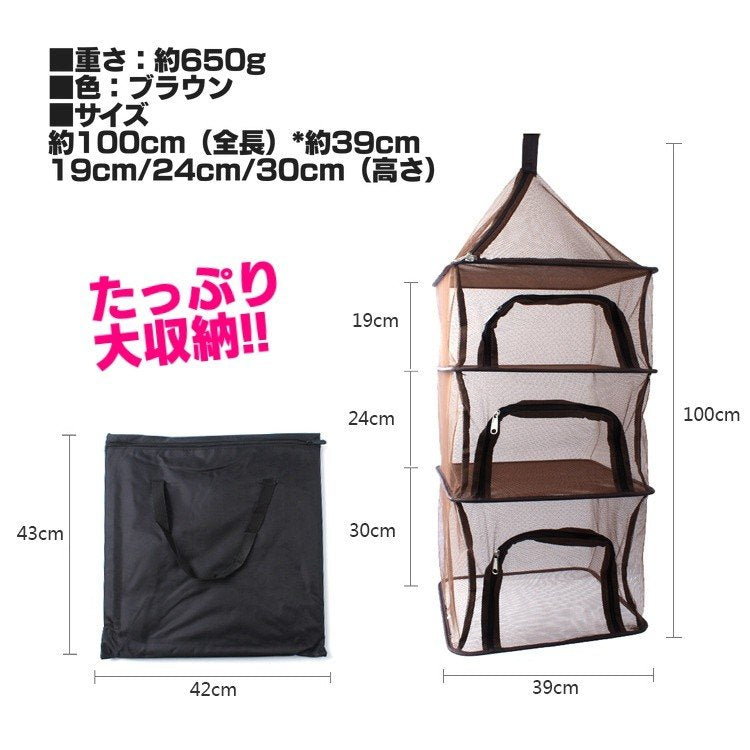 | ・サイズ:39cm*39cm*100cm ・高さ:一段目27cm(三角錐の形状)、二段目19cm、三段目24cm、四段目30cm ・収納バックのサイズ:43cm*42cm ・重量:650g ・耐荷重:約5kg ・カラー:ブラウン ・材質:メッシュ |