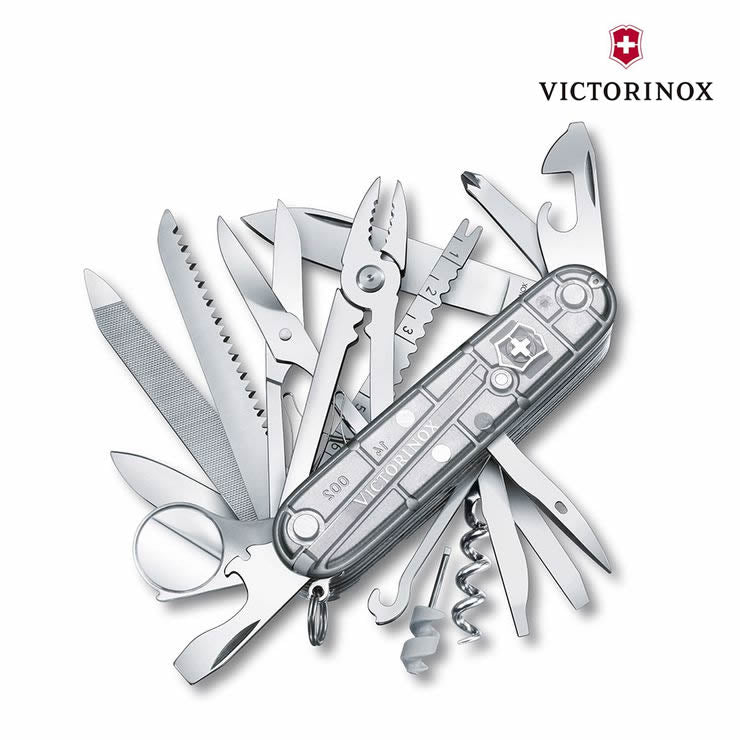 | ■ミディアム・マルチツール(31機能) 毎日の冒険に、常に万端の備えを。 「スイスチャンプ」は、いざという時にその威力を発揮します。 31機能搭載のシルバートランスペアレントハンドル付きマルチツールは完璧なツールです。 常に身のまわりにおいて、日常でのいざという時や、アウトドア活動などに備えましょう。 マイナスドライバーからコルクせん抜き、つまようじからはさみまで、「スイスチャンプ」はまるで万能選手のように活躍します。 ■31機能を搭載したスイス製マルチツール ・ラージブレード ・スモールブレード ・リーマー(穴あけ)、千枚通し ・カン切り ・マイナスドライバー 3mm ・せん抜き ・マイナスドライバー 6mm ・ワイヤーストリッパー ・はさみ ・プライヤー ・ワイヤーカッター ・端子つぶしツール ・うろこ落とし ・はり外し ・スケール(cm) ・スケール(inch) ・のこぎり ・つめやすり ・つめそうじ ・メタルソー ・金属やすり ・ルーペ ・プラスドライバー(フィリップス型1/2) ・マイナスドライバー 2.5mm ・のみ 4mm ・マルチフック ・つまようじ ・ピンセット ・キーリング ・マイナスドライバー(小) ・コルクせん抜き |